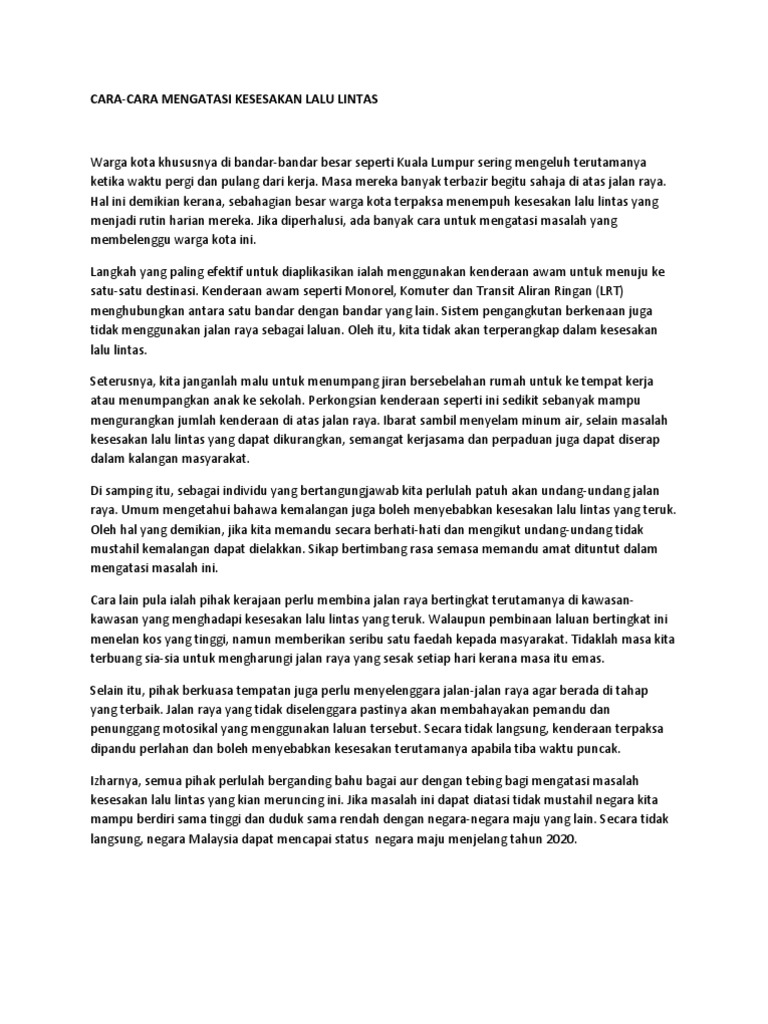 Papan tanda yang disediakan oleh kerajaan bertujuan memastikan keselamatan para. Kaedah lain yang boleh dilakukan bagi mengatasi masalah kesesakan jalan raya adalah dengan menggalakkan pengguna jalan raya untuk mematuhi undang-undang jalan raya. Karangan Langkah Langkah Mengatasi Kemalangan LANGKAH-LANGKAH MENGATASI KEMALANGAN JALAN RAYA ISI PENTING 1.